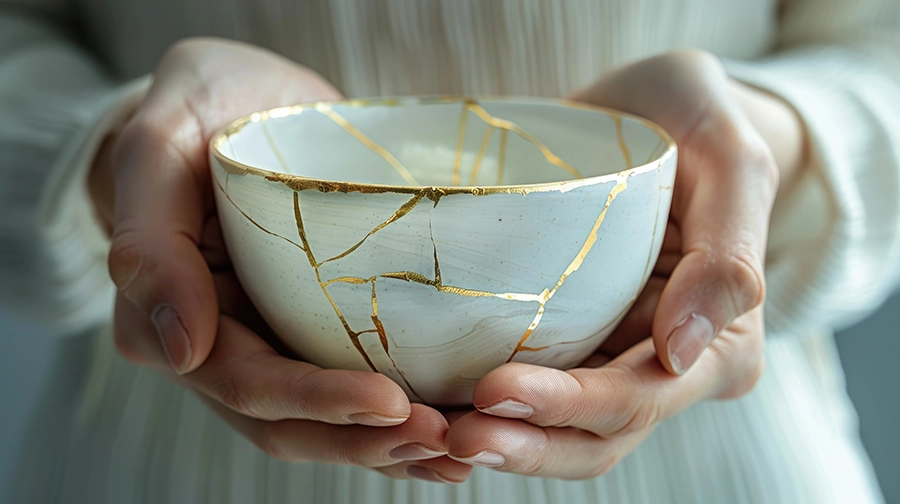 Kintsugi ist eine japanische Kunst, in der Scherben eines gebrochenen Gefäßes wieder zusammengesetzt werden. Mit Kitt, um Stabilität zurückzubekommen und dann im zweiten Schritt werden die Bruchstellen mit Goldstaub beschichtet.
